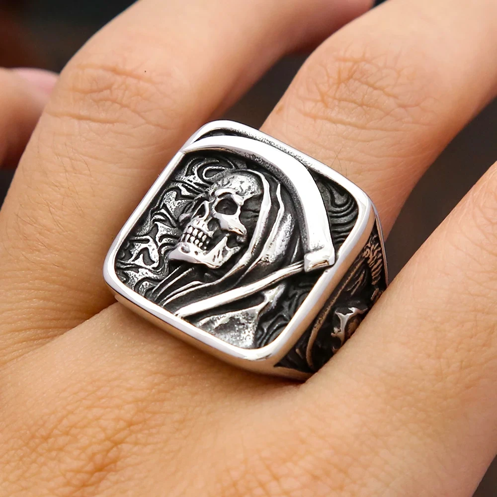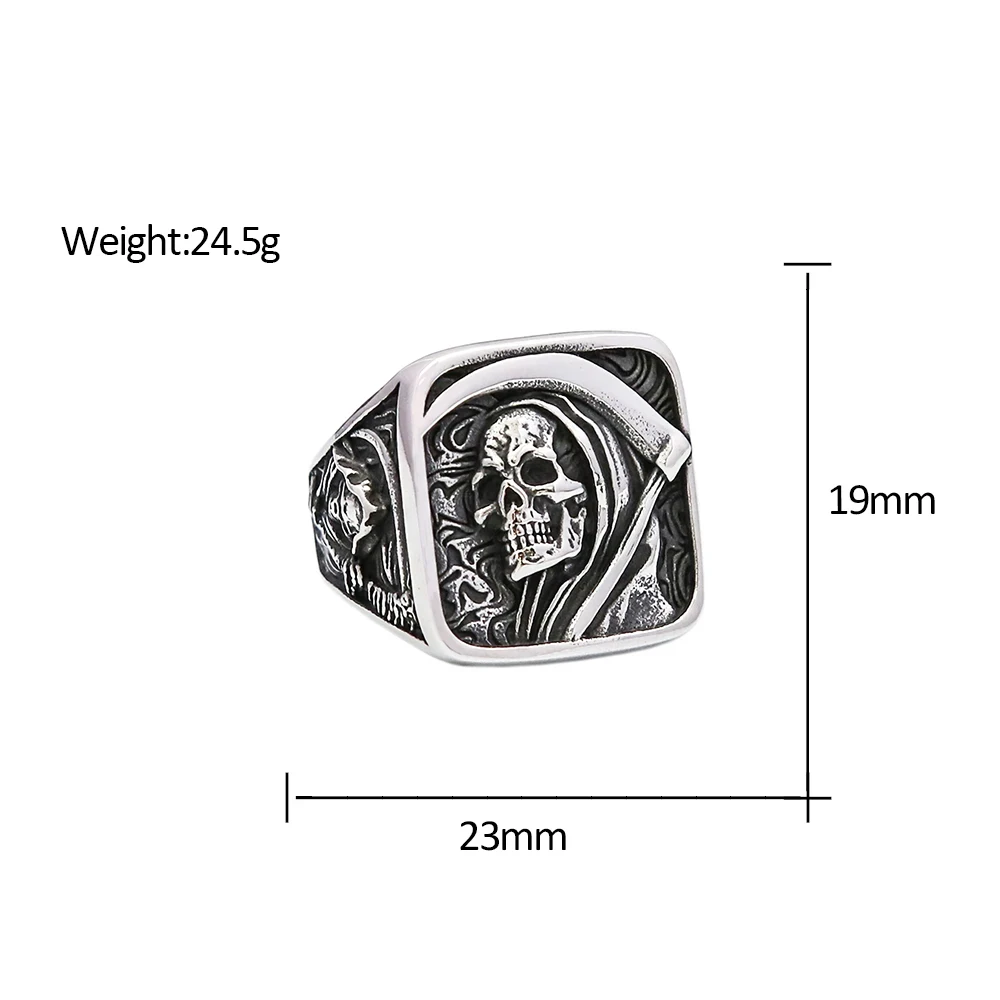 Name:Gothic Vintage Death Sickle Skull Ring for Men 316L Stainless Steel Hip Hop Biker Skeleton Rings Punk Party Jewelry Wholesale